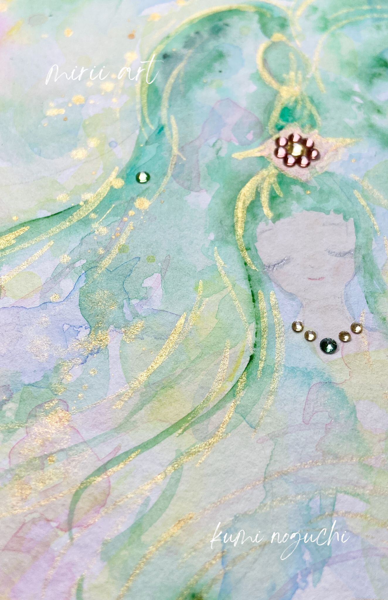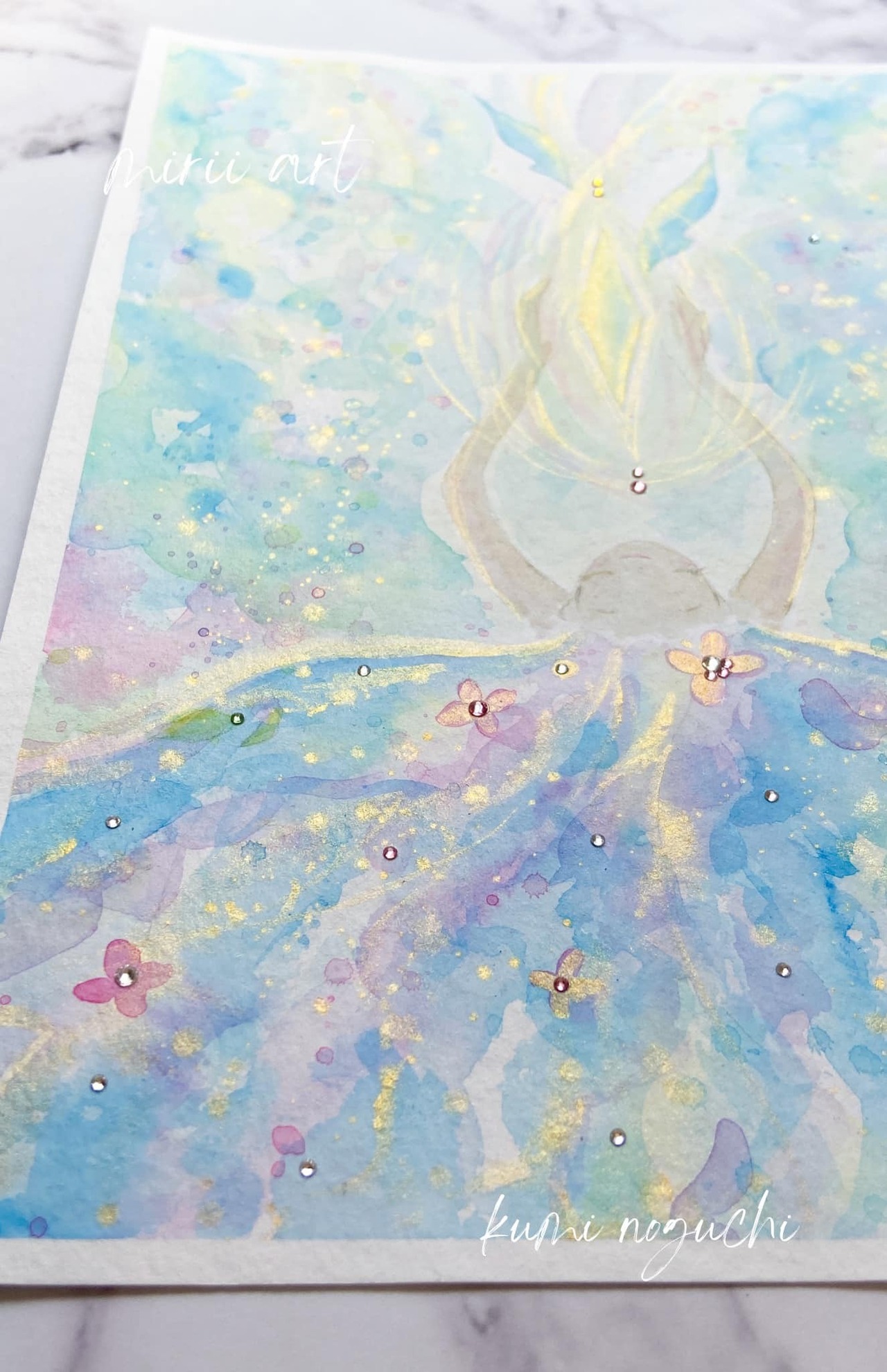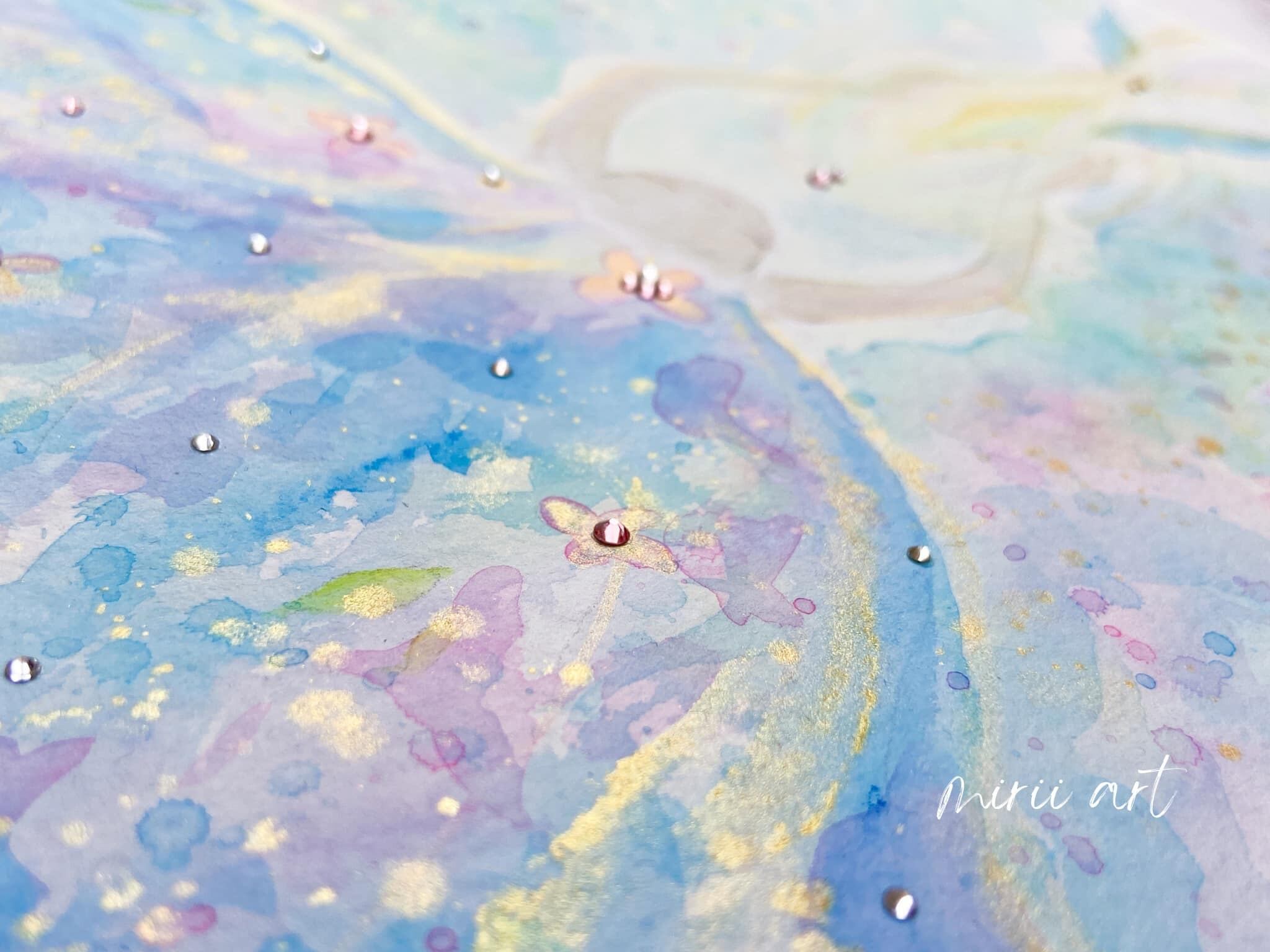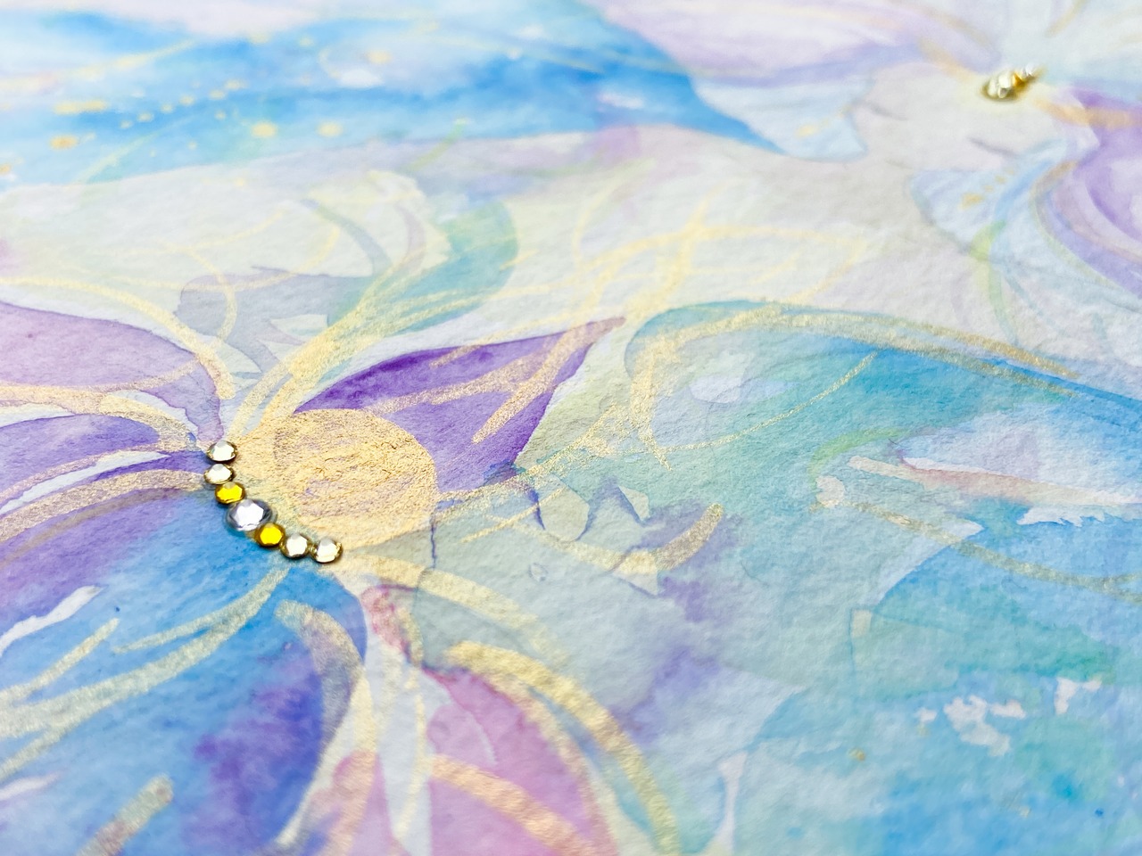 トルション紙、透明水彩絵具、アクリル絵具、水彩色鉛筆、素粒水、スワロフスキー