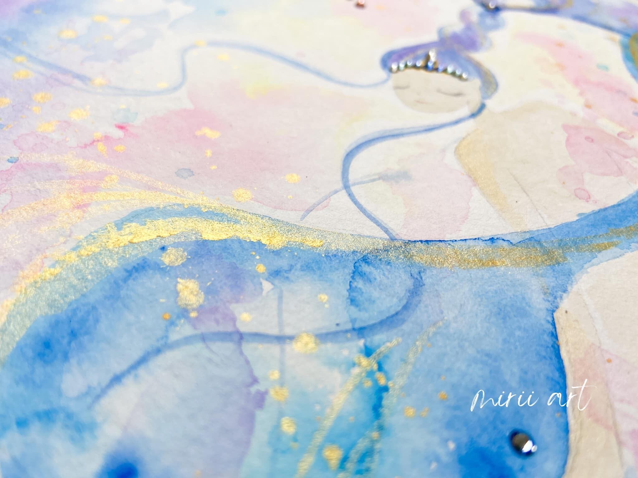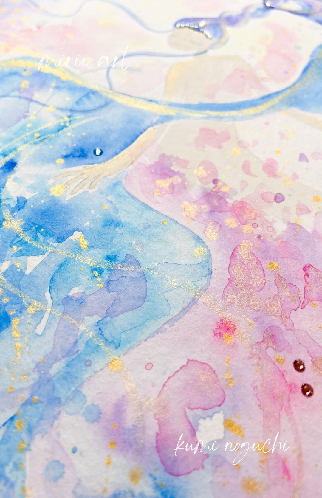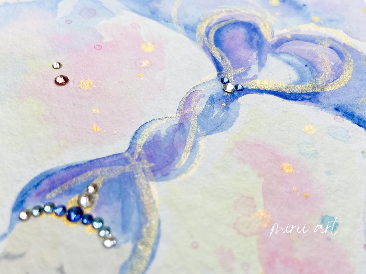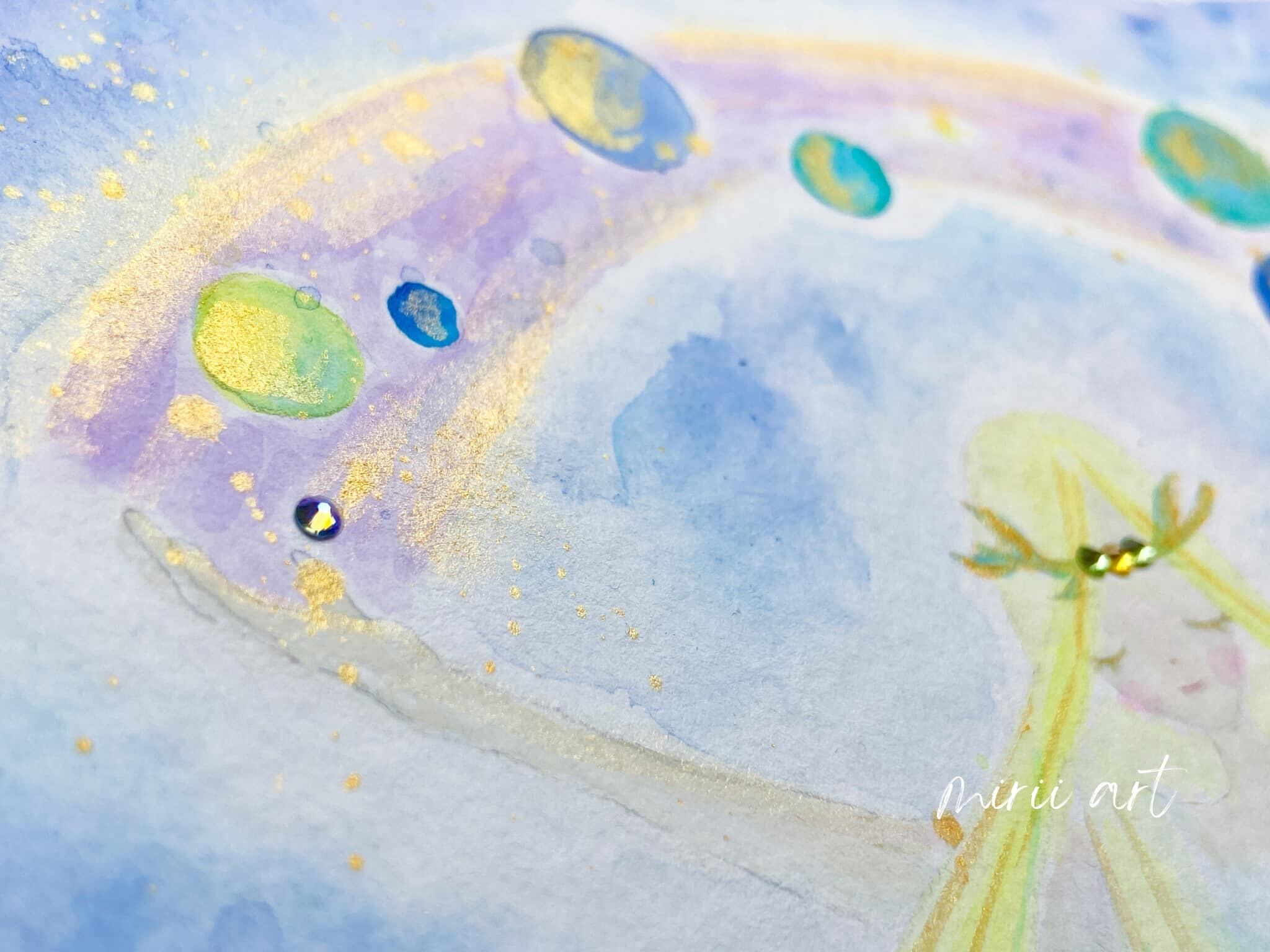 トルション紙、透明水彩絵具、アクリル絵具、水彩色鉛筆、素粒水、スワロフスキー
