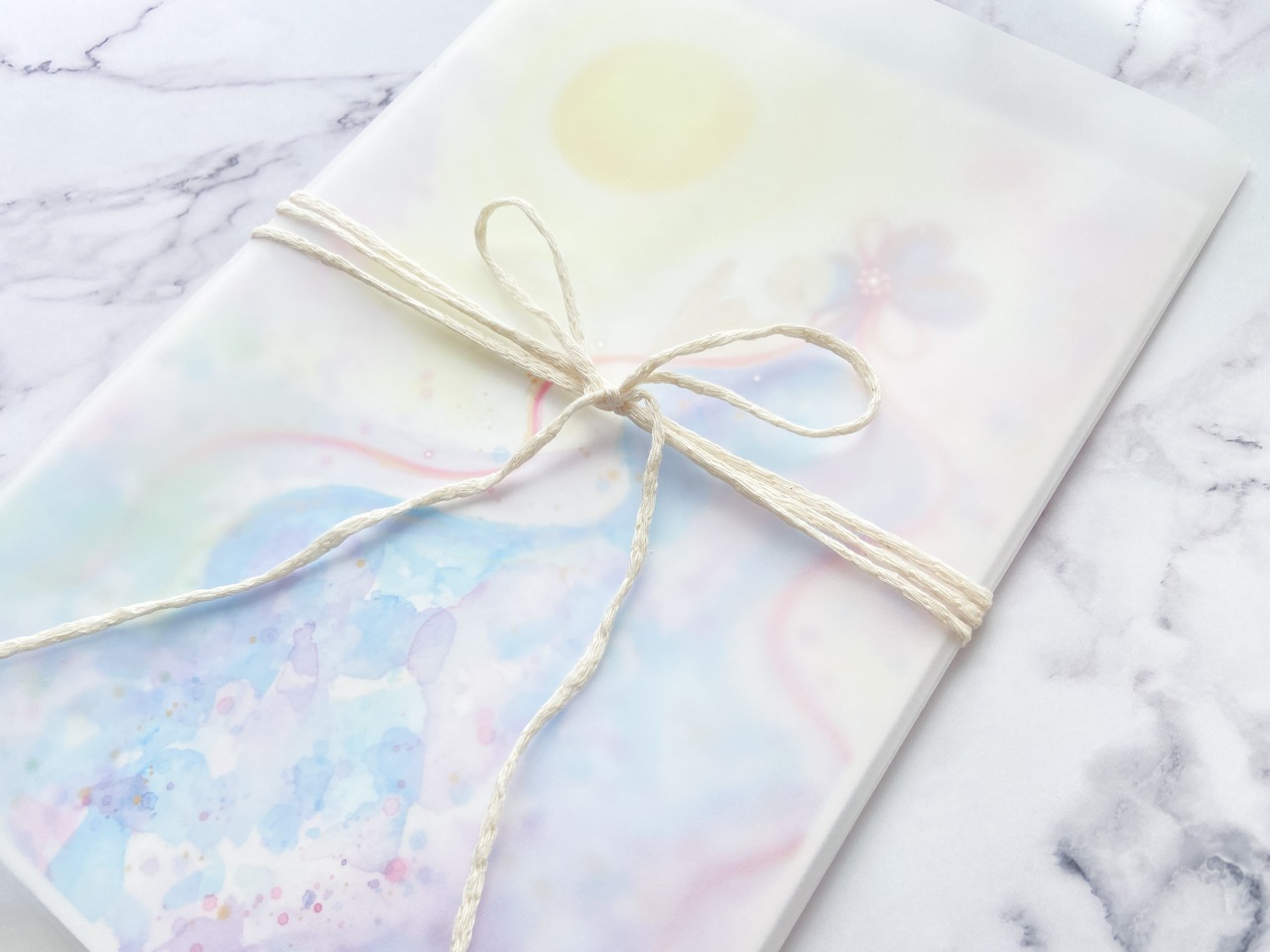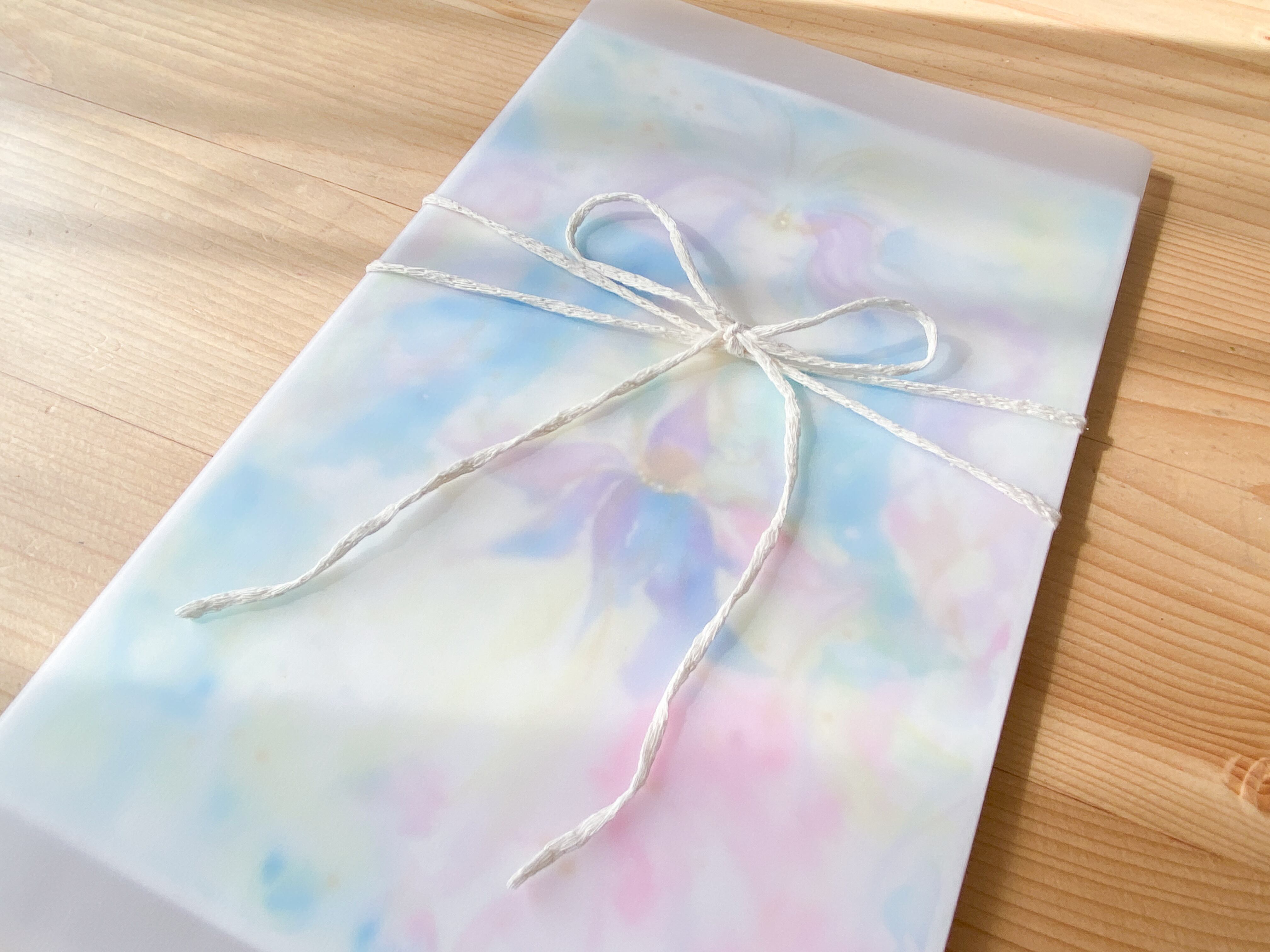 ・水をたくさん含んでおりますので、袋から出して展示していますと、紙が次第に湾曲してきます。気になる方は、袋に入れたまま保存いただくか、額装されることをお勧めします。